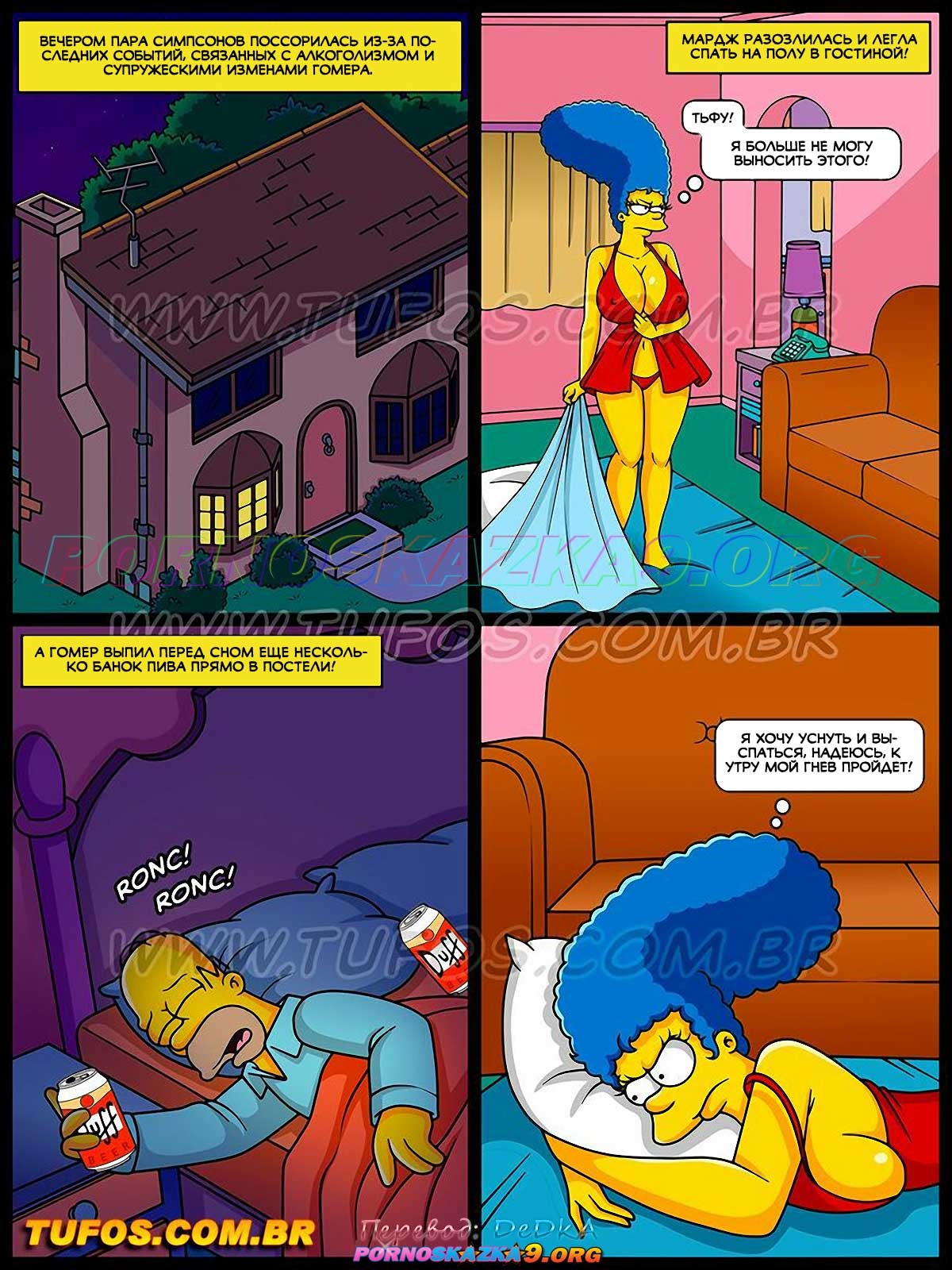 Секс комикс Симпсоны. Часть 52: Ссора супругов лишает их секса. Супружеская парочка Симпсонов поссорилась из-за тех последних событий, которые связанны с беспробудным алкоголизмом и частыми изменами Гомера. Женщина в плохом настроении ушла из спальни и легла спать прямо на полу в гостиной, где ее спящую и увидели похотливые парни Нильсон и Милхаус…