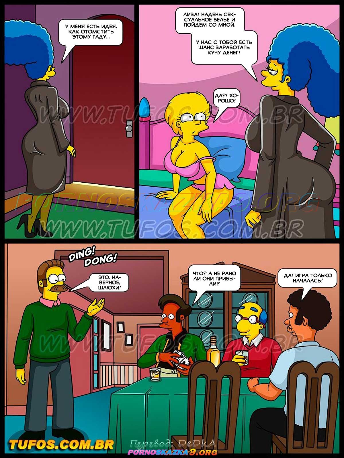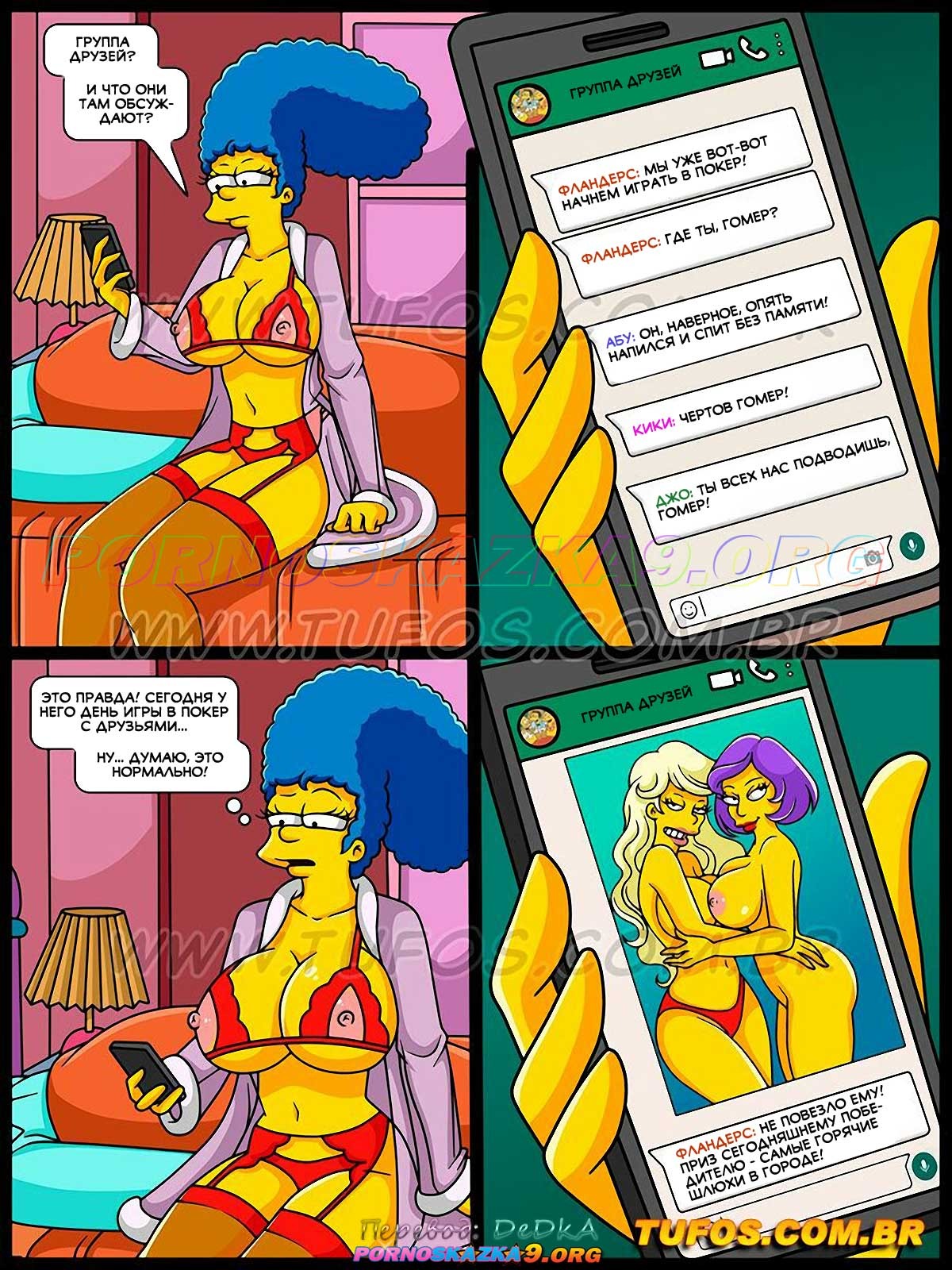 Секс комикс Симпсоны. Часть 51: Месть Мардж. Жаждущая секса Мардж входит в спальню и видит своего мужа храпящим! Воспользовавшись тем, что Гомер крепко спит, пылкая женщина решает проверить его мобильный телефон, который не перестает вибрировать… Просматривая сообщения в Whatsapp, Мардж вскоре обнаруживает, что Гомер перетрахал всех ее лучших подруг…