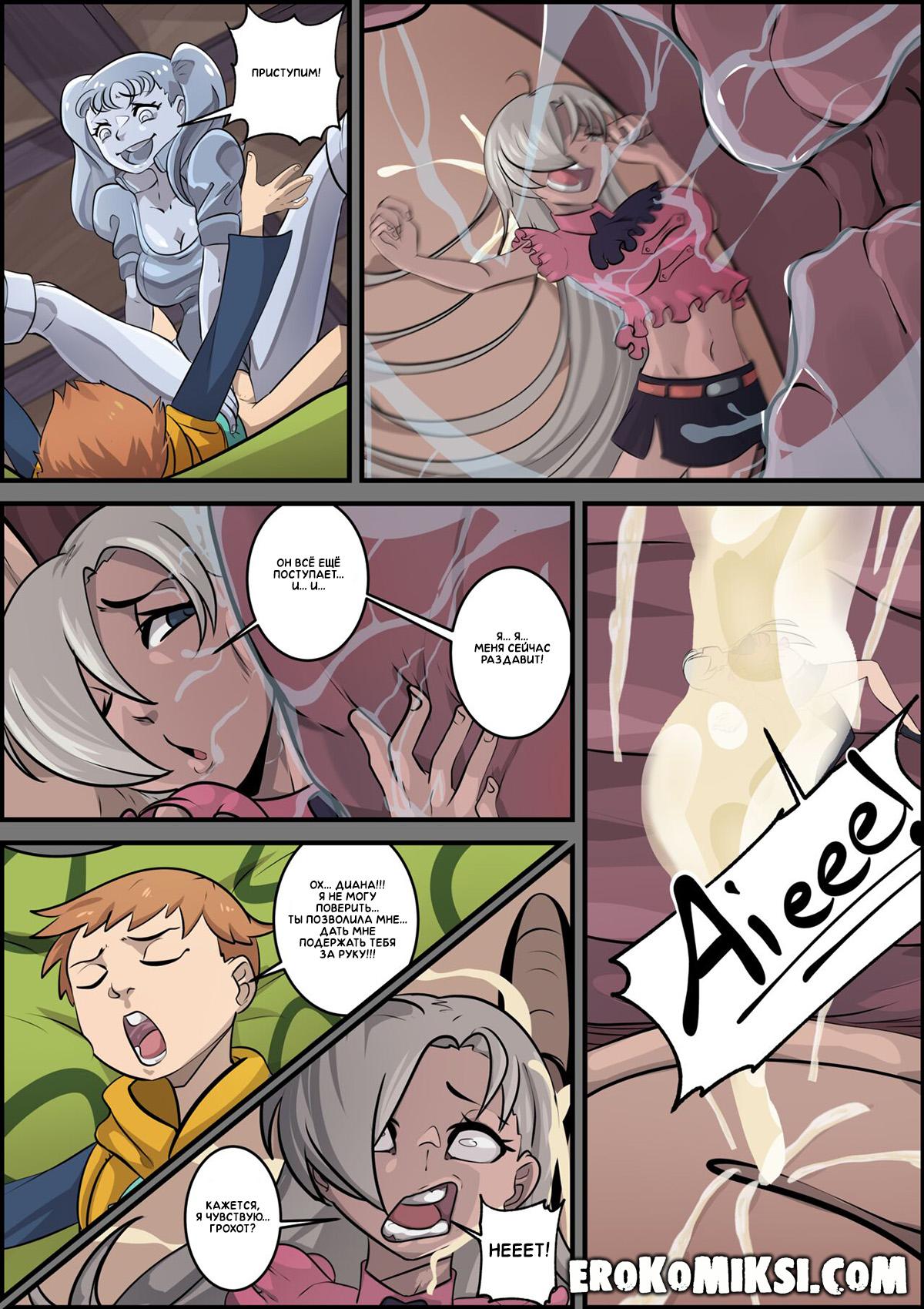 Секс комикс 7 смертных грехов. Я хочу глубже! У великанши Дианы чесалась киска после того, как она случайно засосала ей Элизабет. Диана отправилась к Мелиодасу, в надежде, что если он её трахнет, то зуд в киске пройдёт. Капитан трахнул Диану, но так как его член был слишком мал, он не смог её удовлетворить. Диана отправилась к Кингу, который в это время спал. Увидев огромный член Кинга, Диана забралась на него сверху и вогнала его член так глубоко в свою киску, как только могла…
