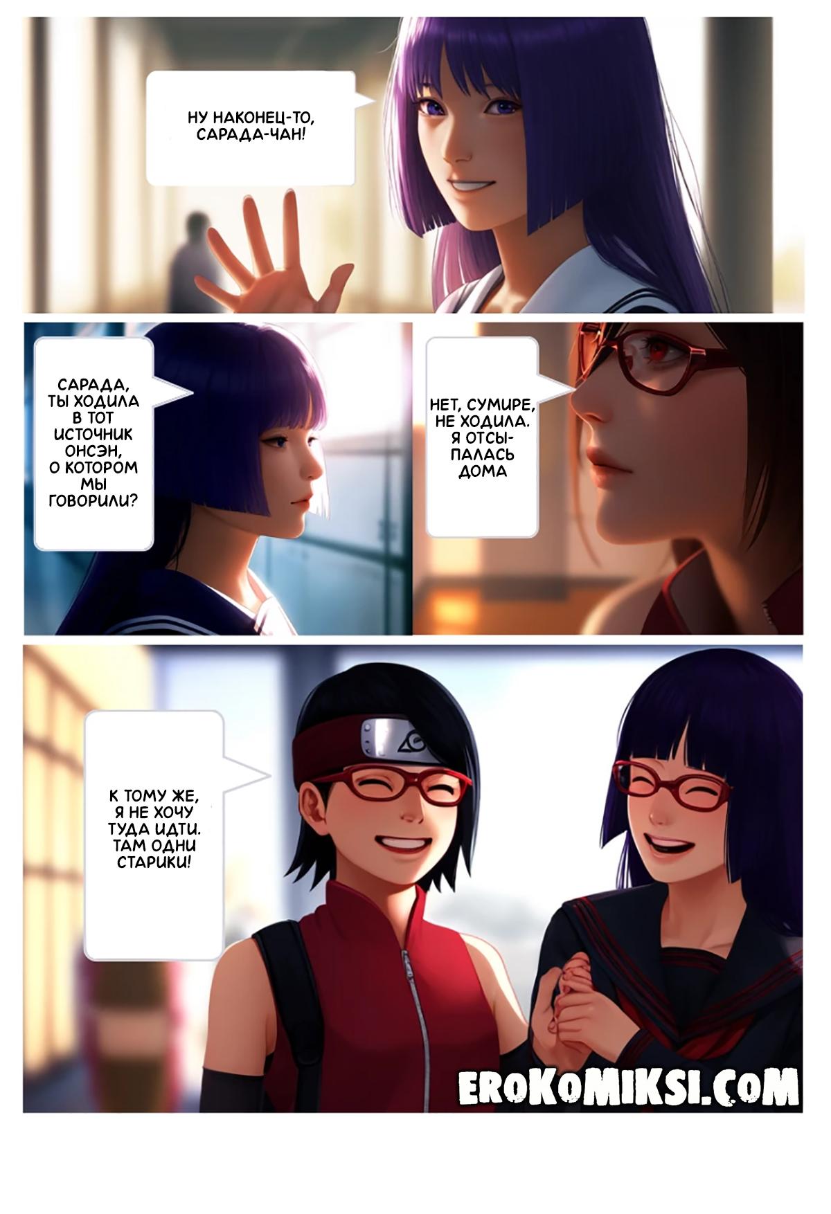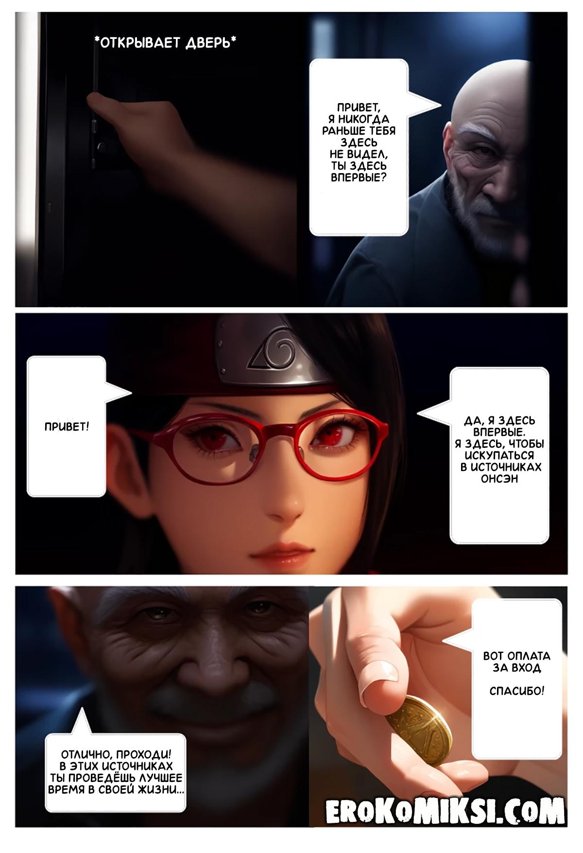 Секс комикс Боруто. Тайны Сарады. Сарада интересовалась у своей подружки Сумире про горячий источник Онсэн. Сумире там сама не была, но слышала об этом месте и что там в основном отдыхают старые извращенцы. Сарада отправилась на источник и встретила там старика, который как следует оттрахал Сараду. Сарада поняла, что ей понравились эти извращения и на следующий день, она вновь отправилась на источники, где её уже ждала толпа старых извращенцев…