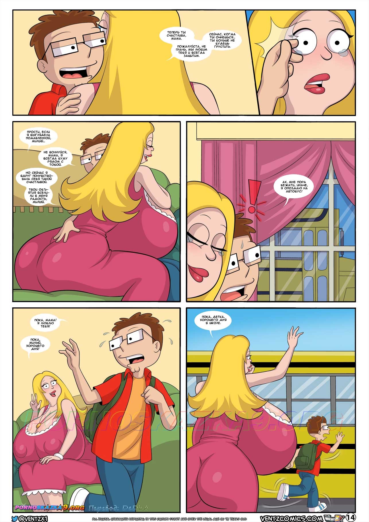 Блин классный порно комикс на самом интересном месте закончился , мой любимый момент это сон Стива Смита где Стив Смит был на пляже с Мамой Франсин Смит , и сестрой Хейли и тётей Гвен Девушками с огромными сиськами мне больше понравилось фраза мамы сестры и тёти мы все любим тебя Стив наслаждайся шоу когда Мама Франсин , сестра Хейли и тётя Гвен показали свои огромные груди