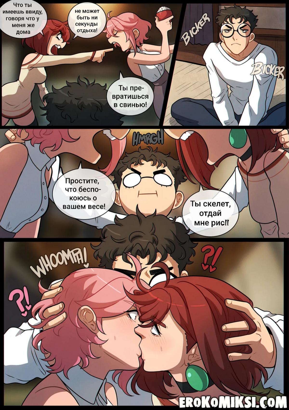 Секс комикс Dandadan. Делиться — значит проявлять заботу. Sharing is Caring. Kinkymation. Две возбужденные красотки решили повеселиться с Окаруном. Они разделись и стали вместе сосать его большой член, после чего раздвинули ножки и дали по очереди себя поиметь…