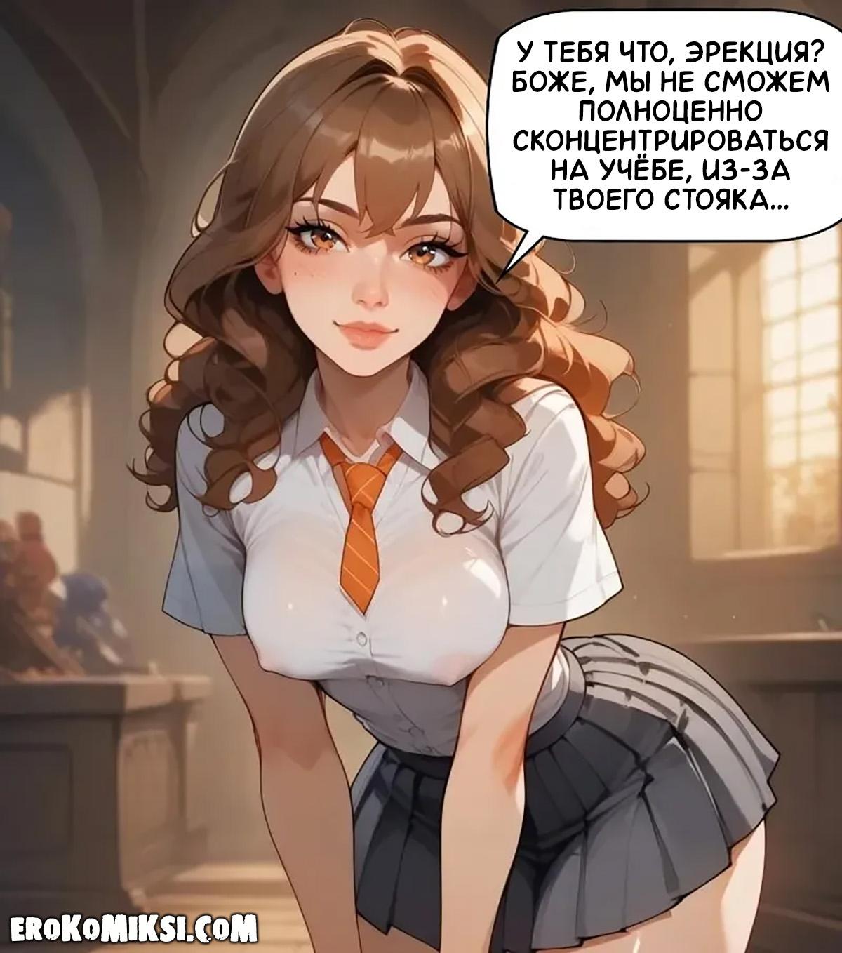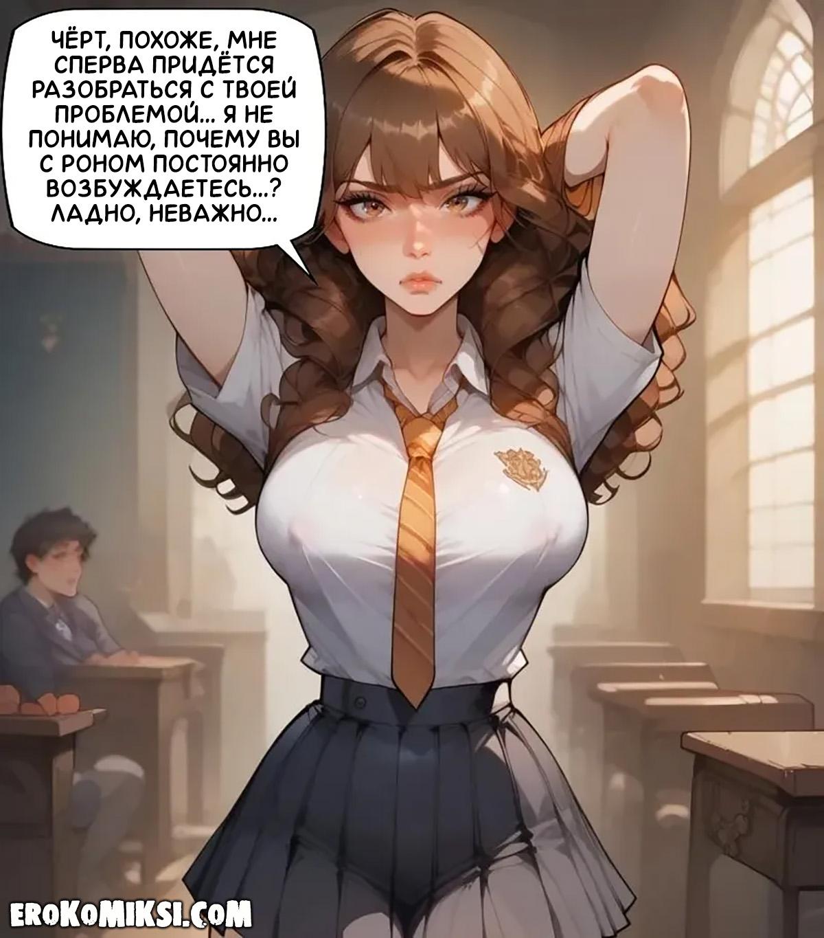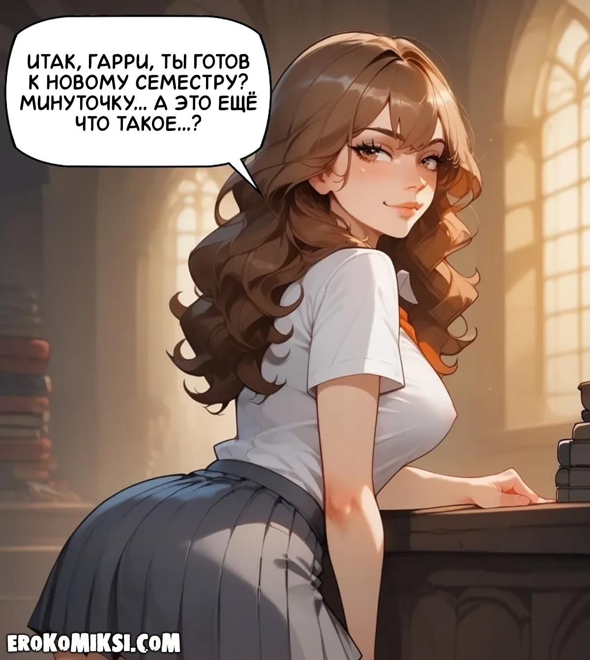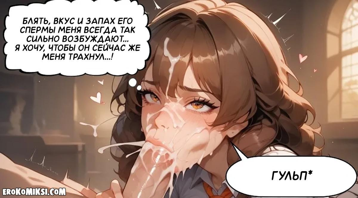 Секс комикс Гарри Поттер. Концентрация на учёбе. Чтобы ничто не отвлекало от учёбы, Гарри и Гермиона решают выплеснуть свою сексуальную энергию и потрахаться. Гермиона опускается на колени и принимается сосать огромный член Гарри, а затем встаёт раком, чтобы он как следует оттрахал её тугую киску…