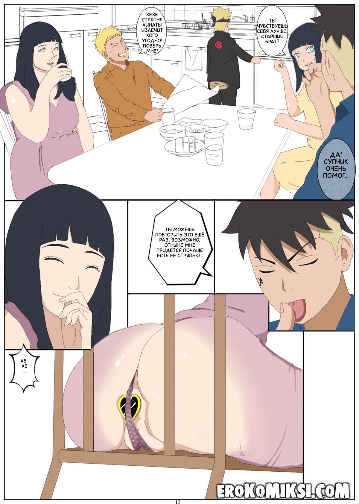Секс комикс Наруто. Утренний комфорт. Выздоровление Каваки. У Каваки слишком слабый иммунитет и из-за этого он часто болеет. Его мама Хината, лечила его традиционными способами и давала супчик для восстановления сил. Однако у Каваки были свои мысли по этому поводу и он решил, что секс с мамой, будет лучшим исцелением и восстановлением сил. Ну разве могла Хината отказаться удовлетворить своего сыночка, тем более, когда речь идёт о его здоровье…