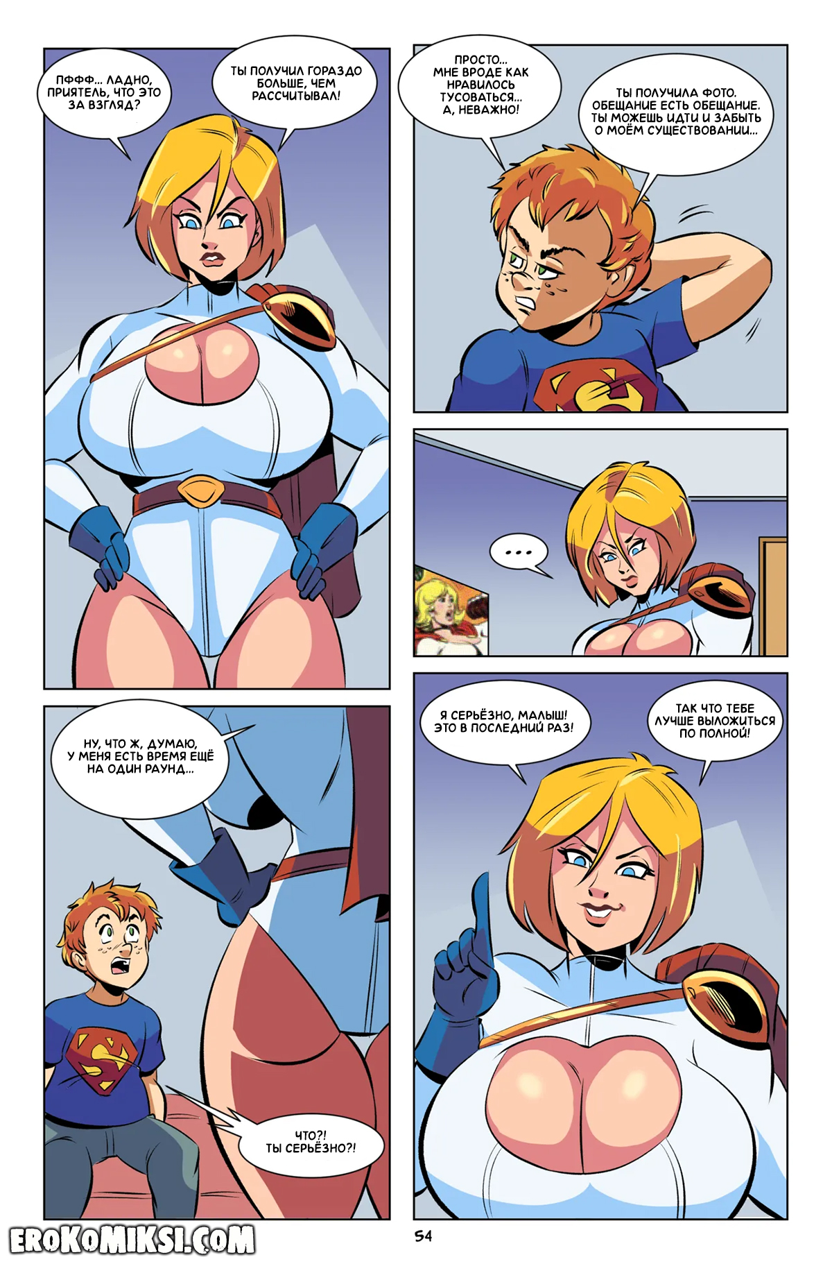 Секс комикс Пауэр Гёрл. Юный Шантажист. Паренёк собрал компромат на Пауэр Гёрл и теперь шантажирует сильную и могущественную красотку. Пауэр выполняет все прихоти паренька и делает всё, что тот пожелает…но желания у паренька обычно однообразны, пожрать, в приставку поиграть и…чтобы Пауэр ему отсосала и устроила сиськотрах…