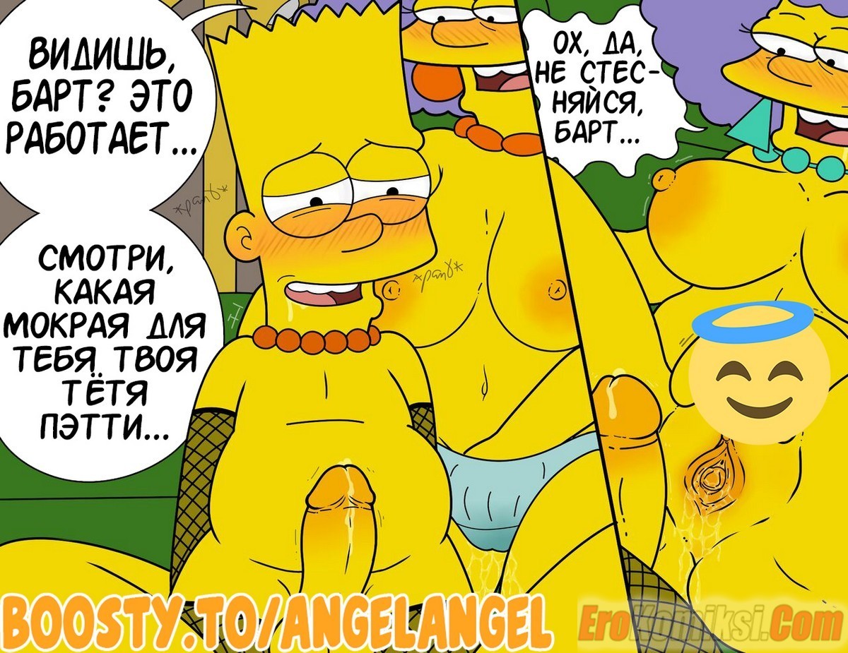 Секс комикс Симпсоны. Путь. Аппетитные большегрудые тетки Барта пригласили парня к себе домой, устроить, так сказать сексуальную оргию. Только условием того, что Барт их трахнет было то, что он накрасится. Парню было все равно, лишь бы присунуть во все щели зрелым милфам…