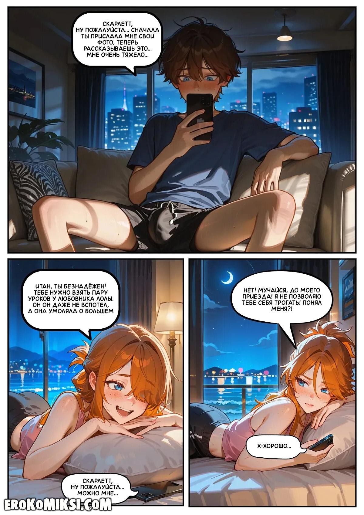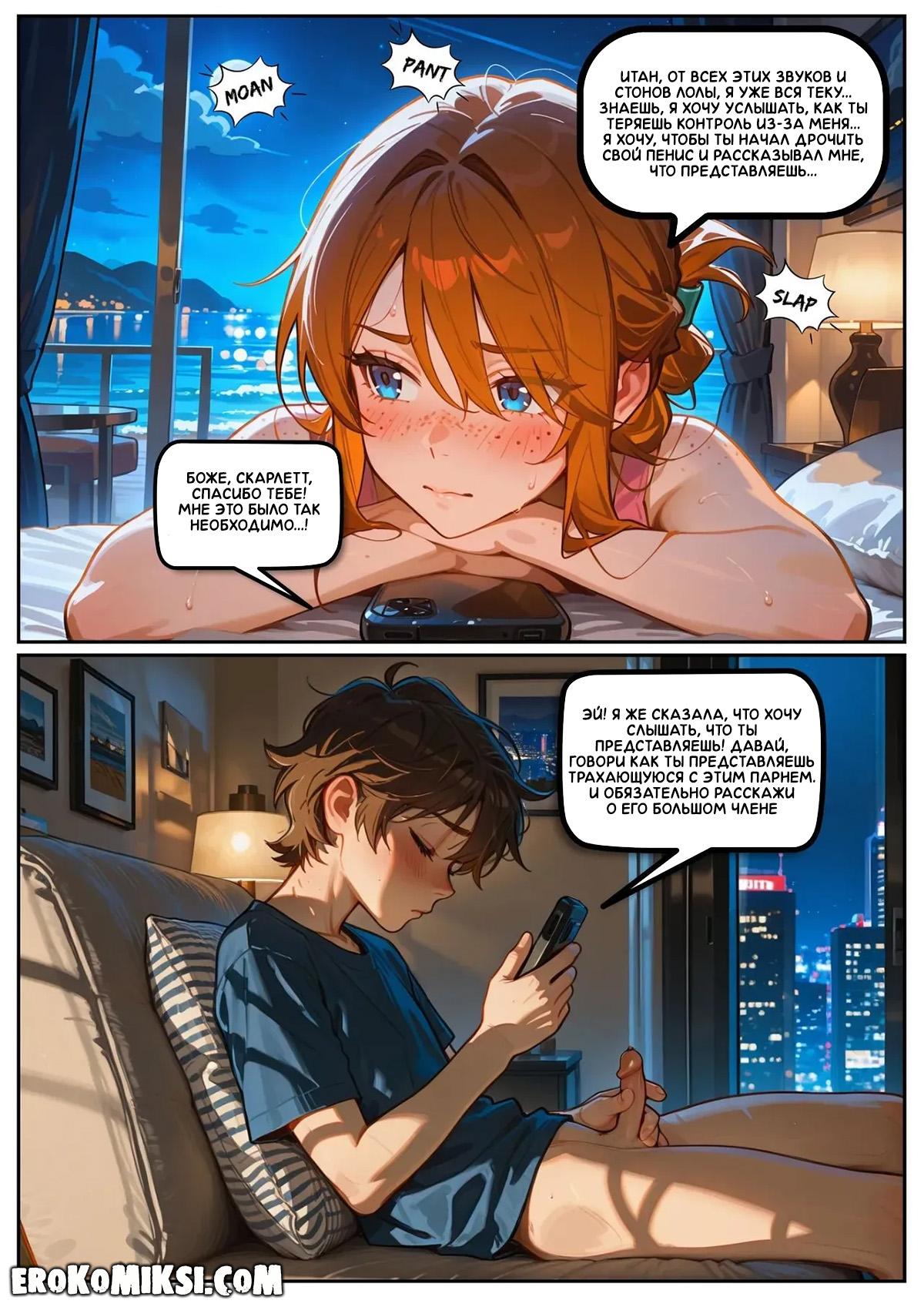 Секс комикс Скарлетт Блейз. Часть 5. Награда за сдержанность. Скарлетт под впечатлением от Лолы и делится этим с Итаном, рассказывая ему обо всём, что увидела. Во время разговора они возбуждаются и занимаются сексом по телефону…