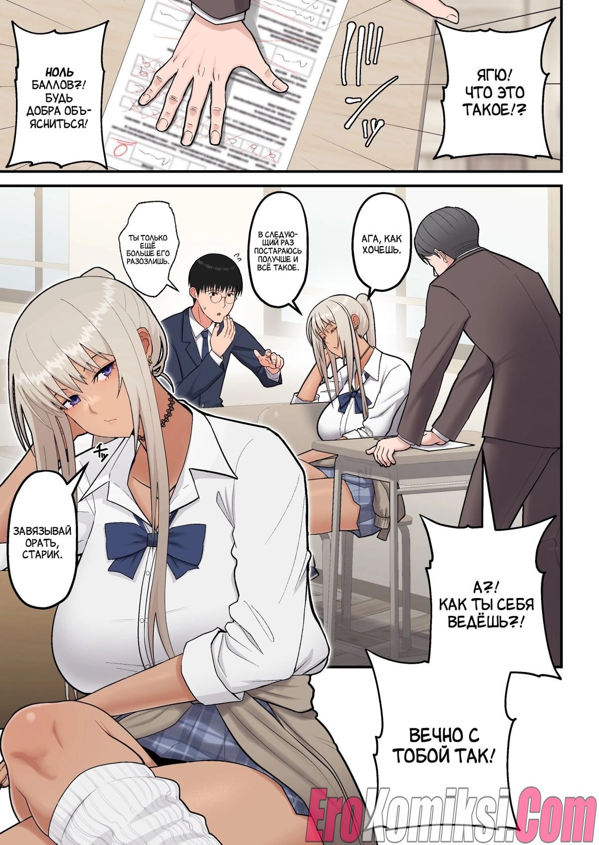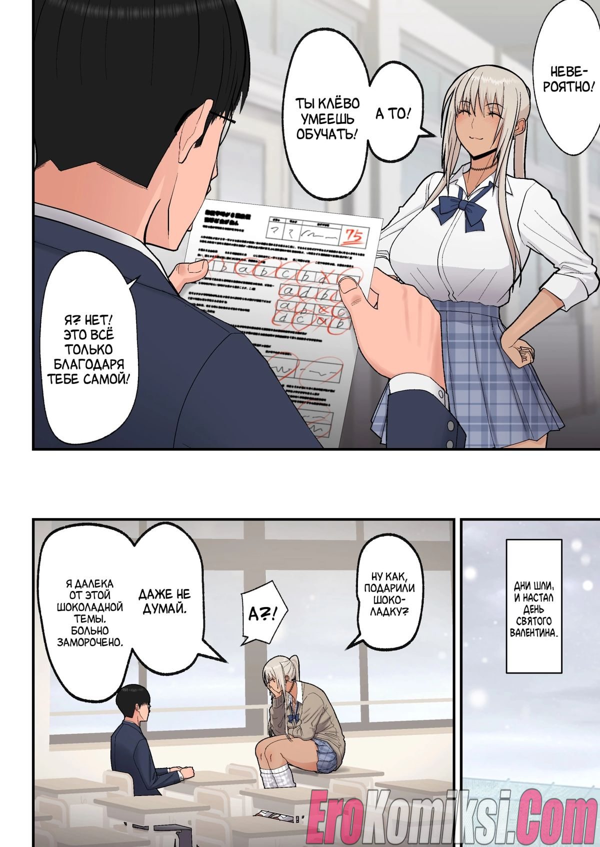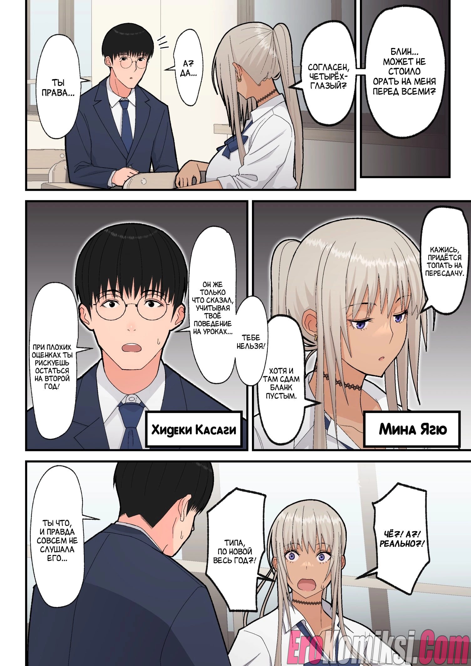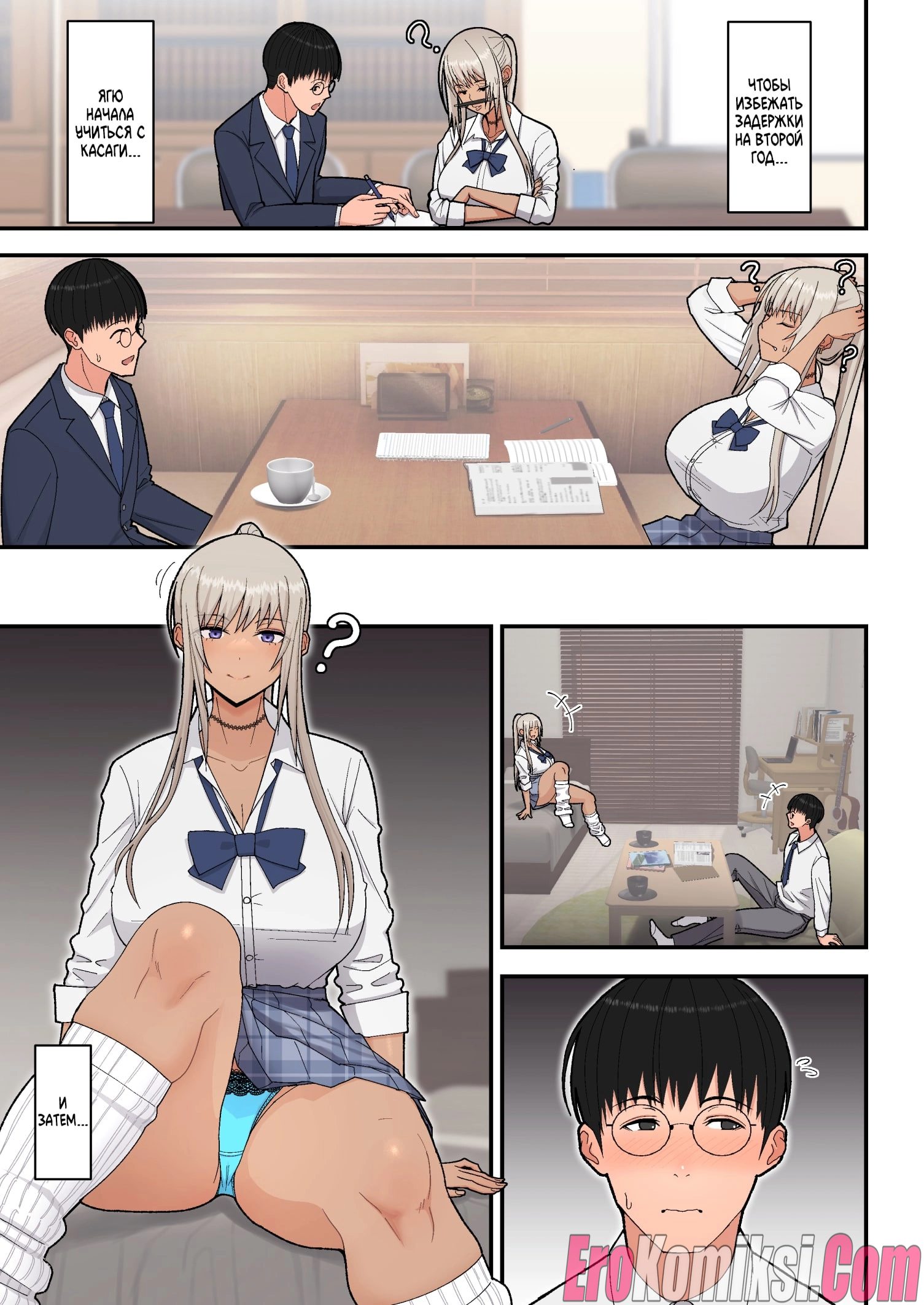 Секс комикс Сладкая любовь с гяру-блондинкой. Когда Мина узнала, что провалила экзамен и повторный, это её последний шанс, она обратилась за помощью к однокласснику Хидеки. Парень помог ей, обучил её предмету и девушка сдала экзамен на 75 баллов. После этого она решила поблагодарить Хидеки и отправилась с ним в любовный отель. Там Хидеки впервые занялся сексом с девушкой…