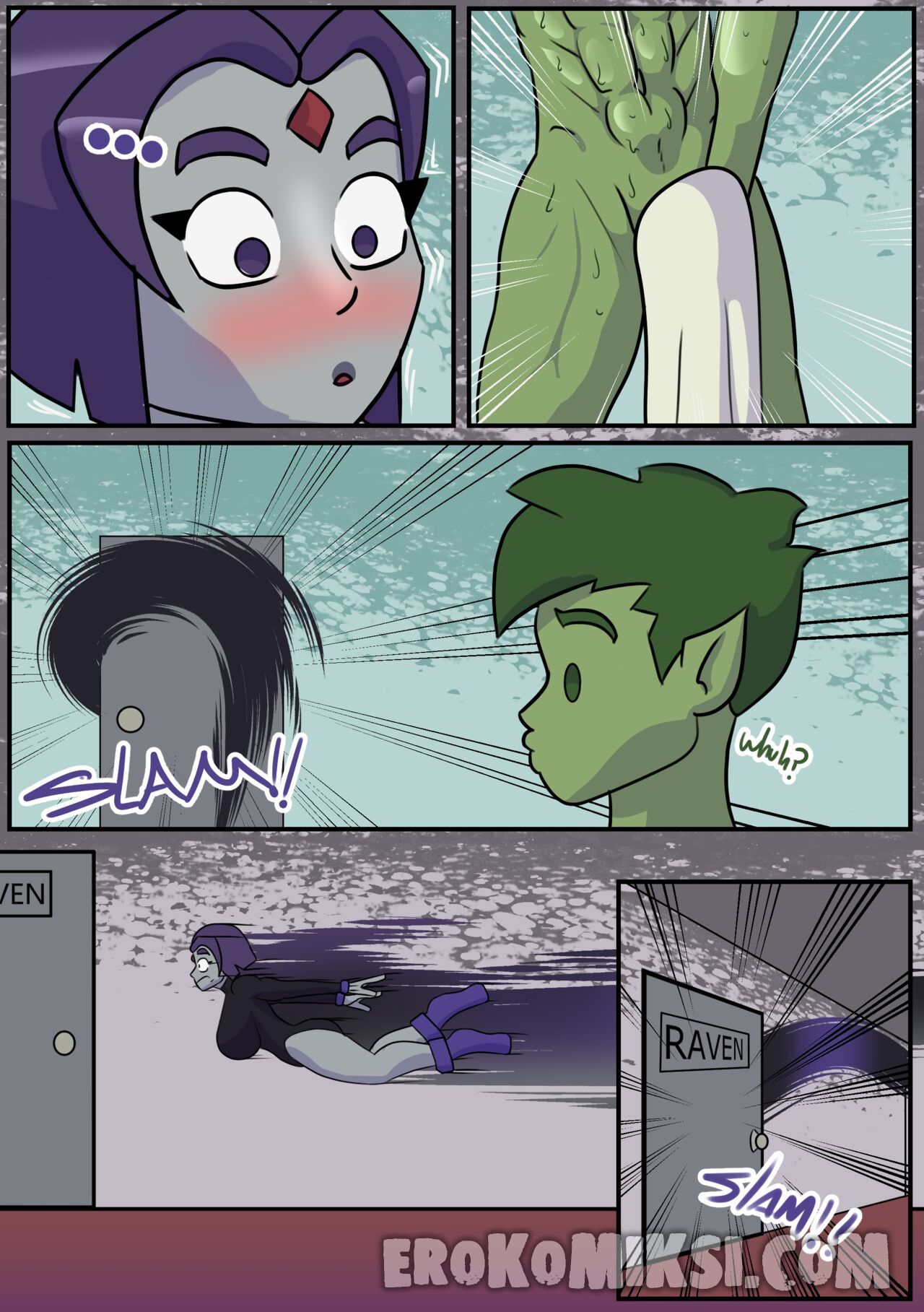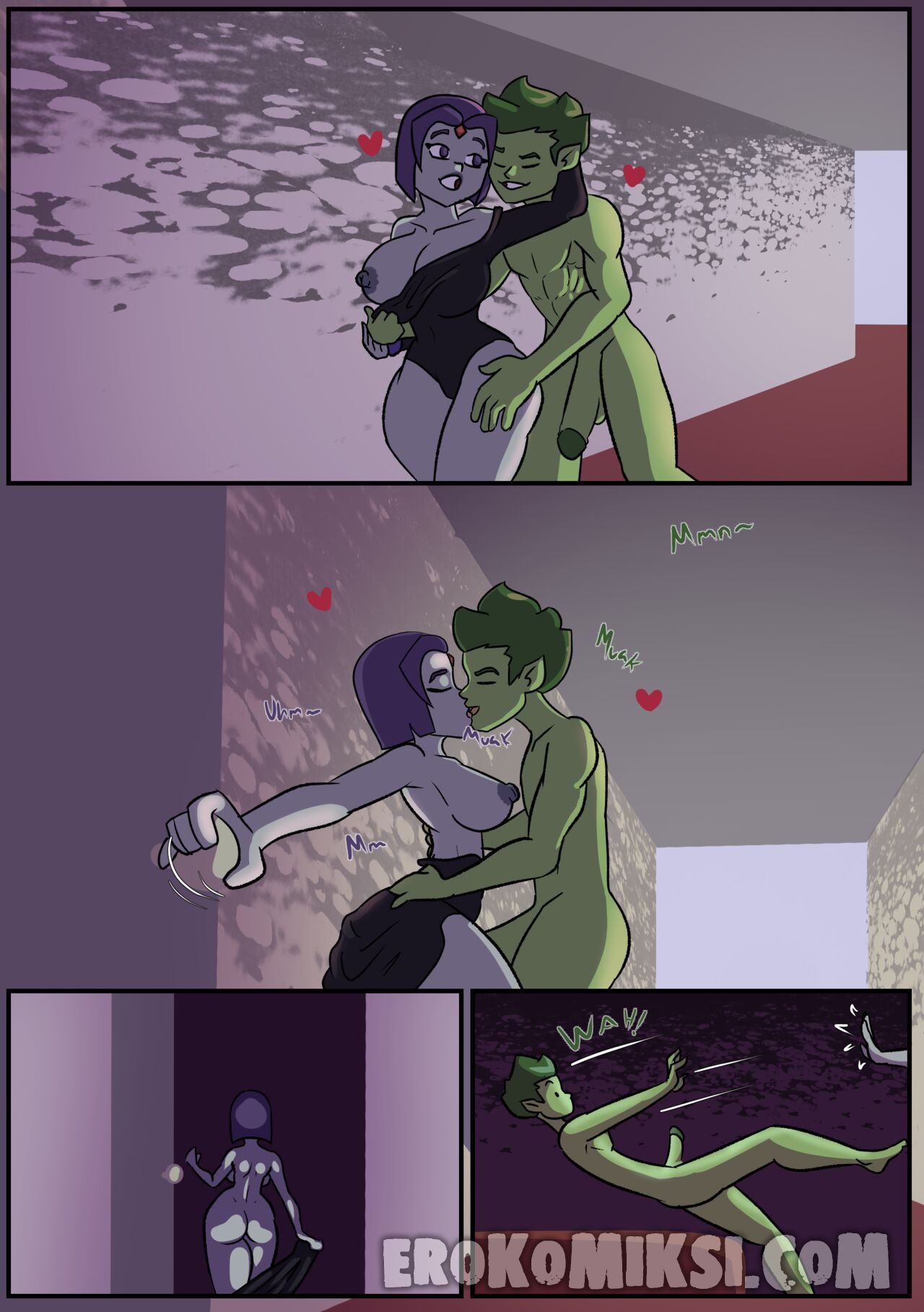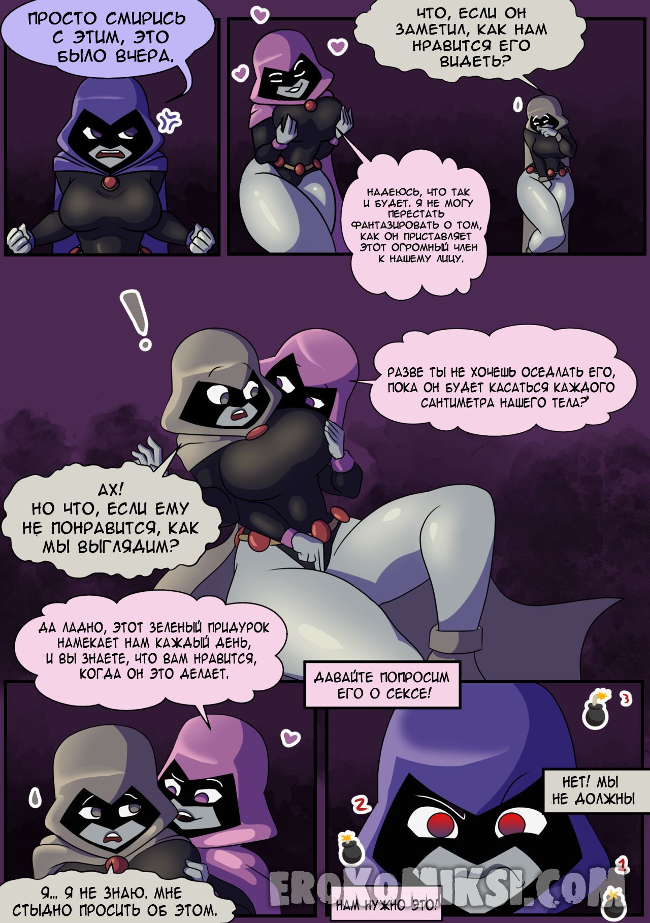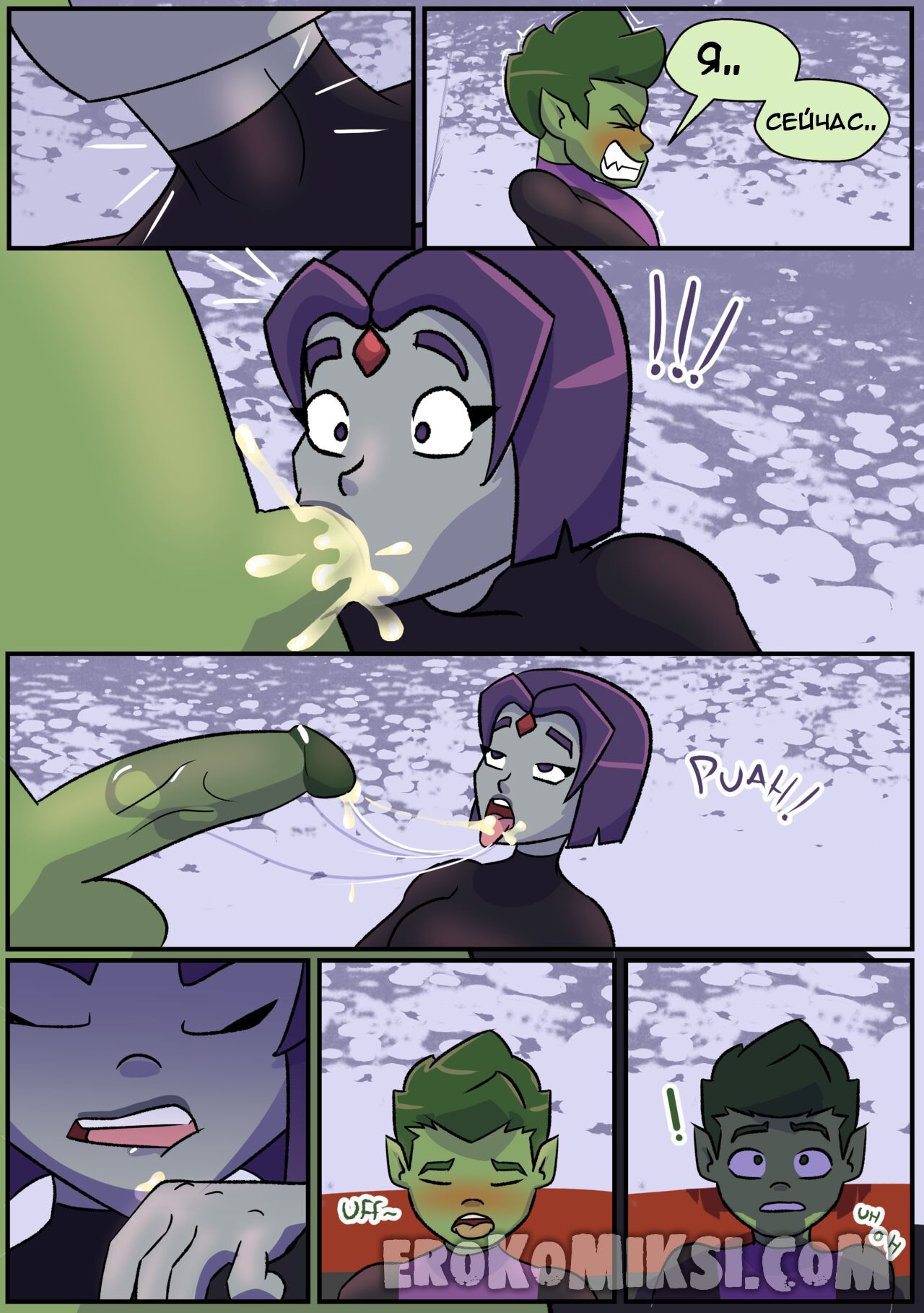Секс комикс Титаны. Бурные чувства. Не спокойная Рейвен постоянно мечтает о сексе с Бист Боем, от чего не может сосредоточится. Однако вскоре ей выдался прекрасный момент где она смогла оторваться с ним на всю катушку, трахаясь весь день…