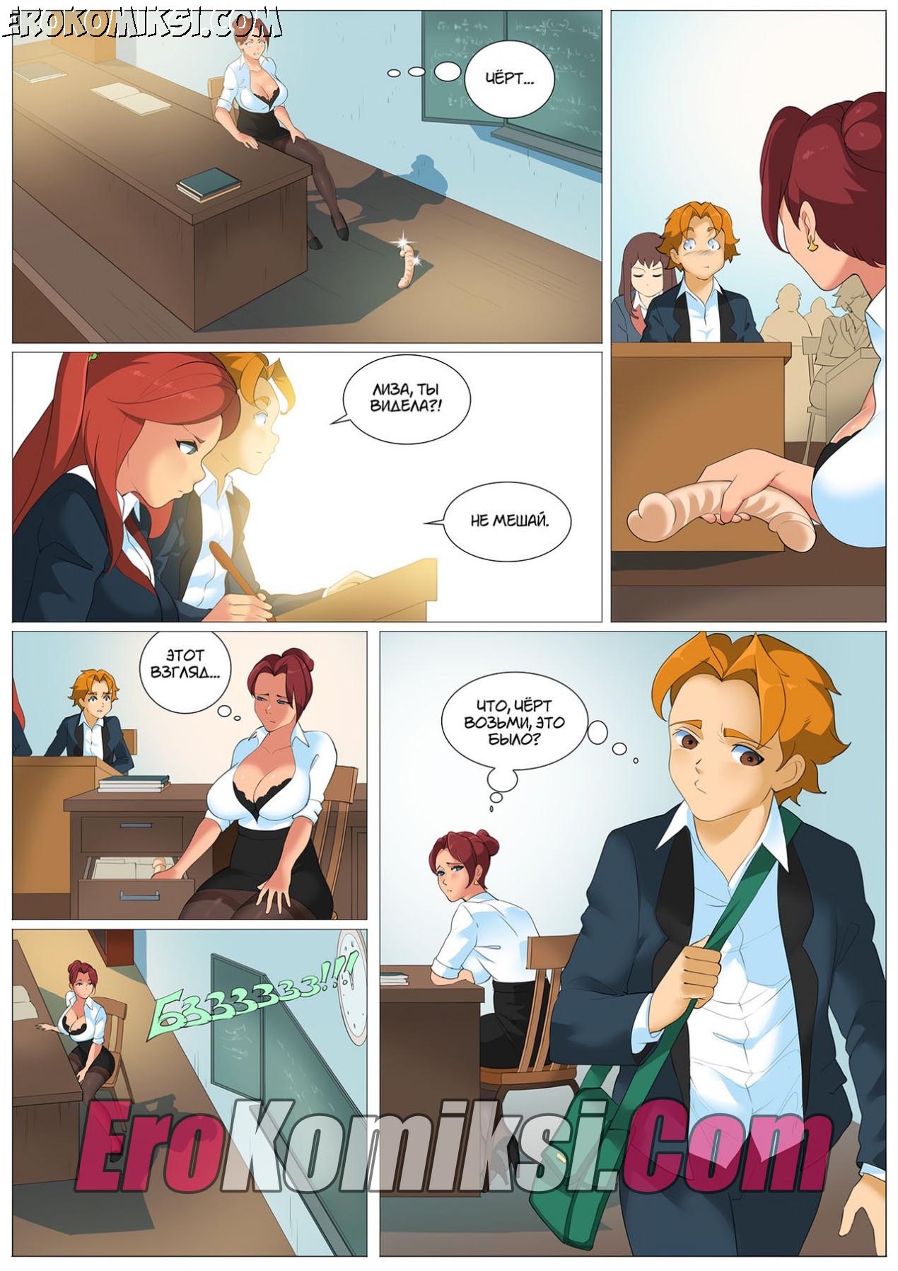 Секс комикс Тяга к учебе. Бывает учительница может понравится, но когда твоя преподавательница — это шикарная милфа с большими сиськами и упругой попкой, а о том, как бы ее трахнуть, а вечный стояк не дает встать из — за парты…
