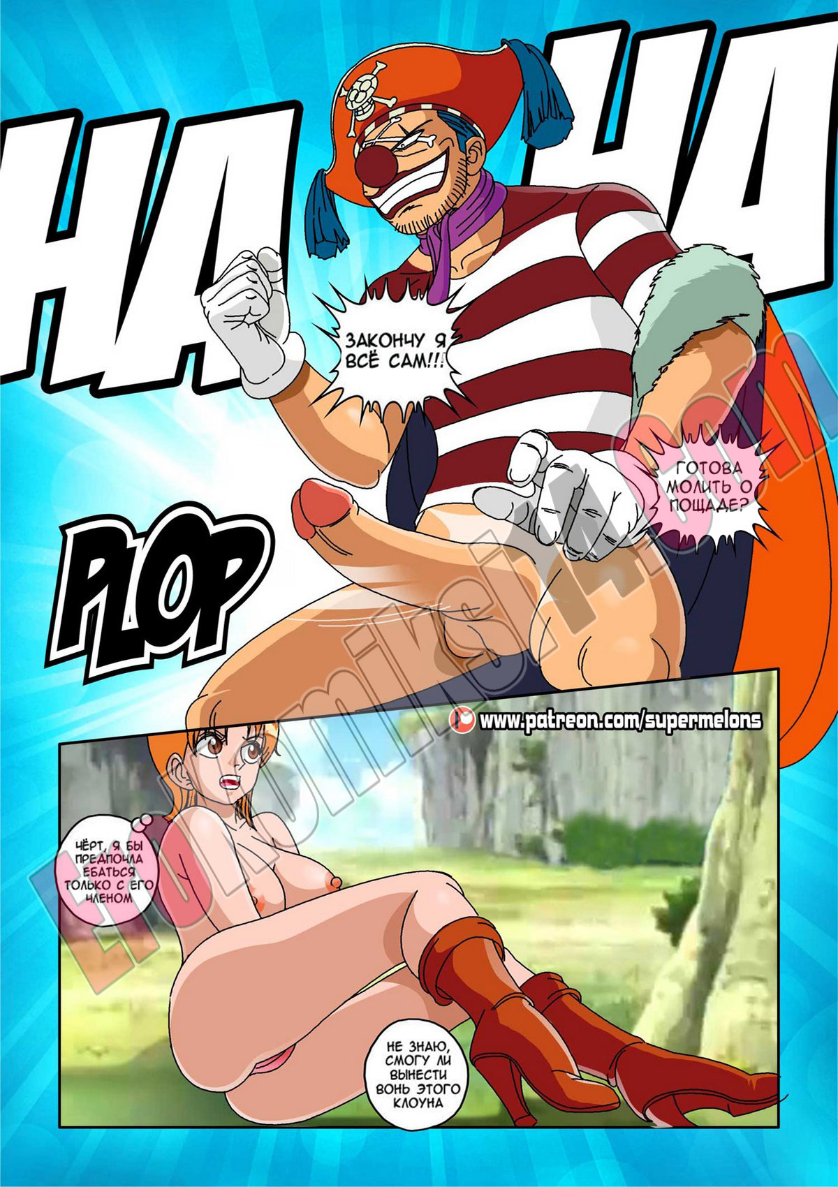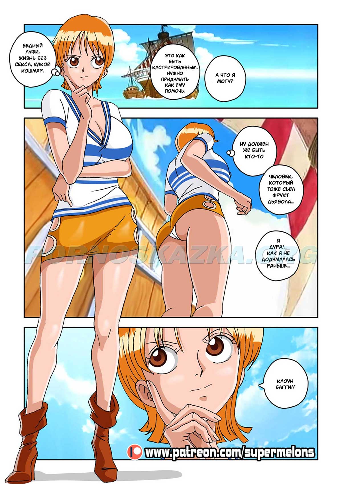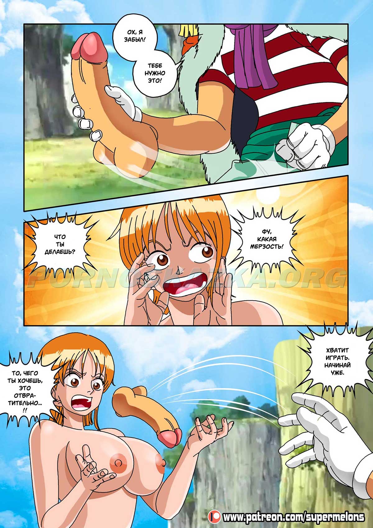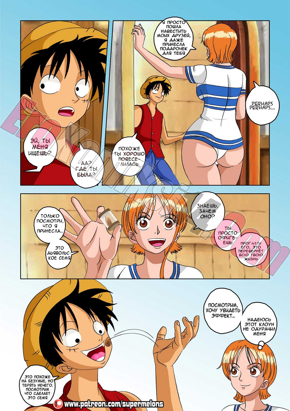 Секс комикс Ван Пис. Семя дьявола. Один юноша слопал фрукт дьявола и после этого его тело, типа, начало сдуваться, парень разучился плавать и самое важное: у него пропал стояк! И такое западло, по поводу эрекции выяснилось как раз в тот момент, когда сексапильная девушка предложила ему трахаться! Парня, конечно жаль, а девушка… да, эта сучка нашла ему уже замену…
