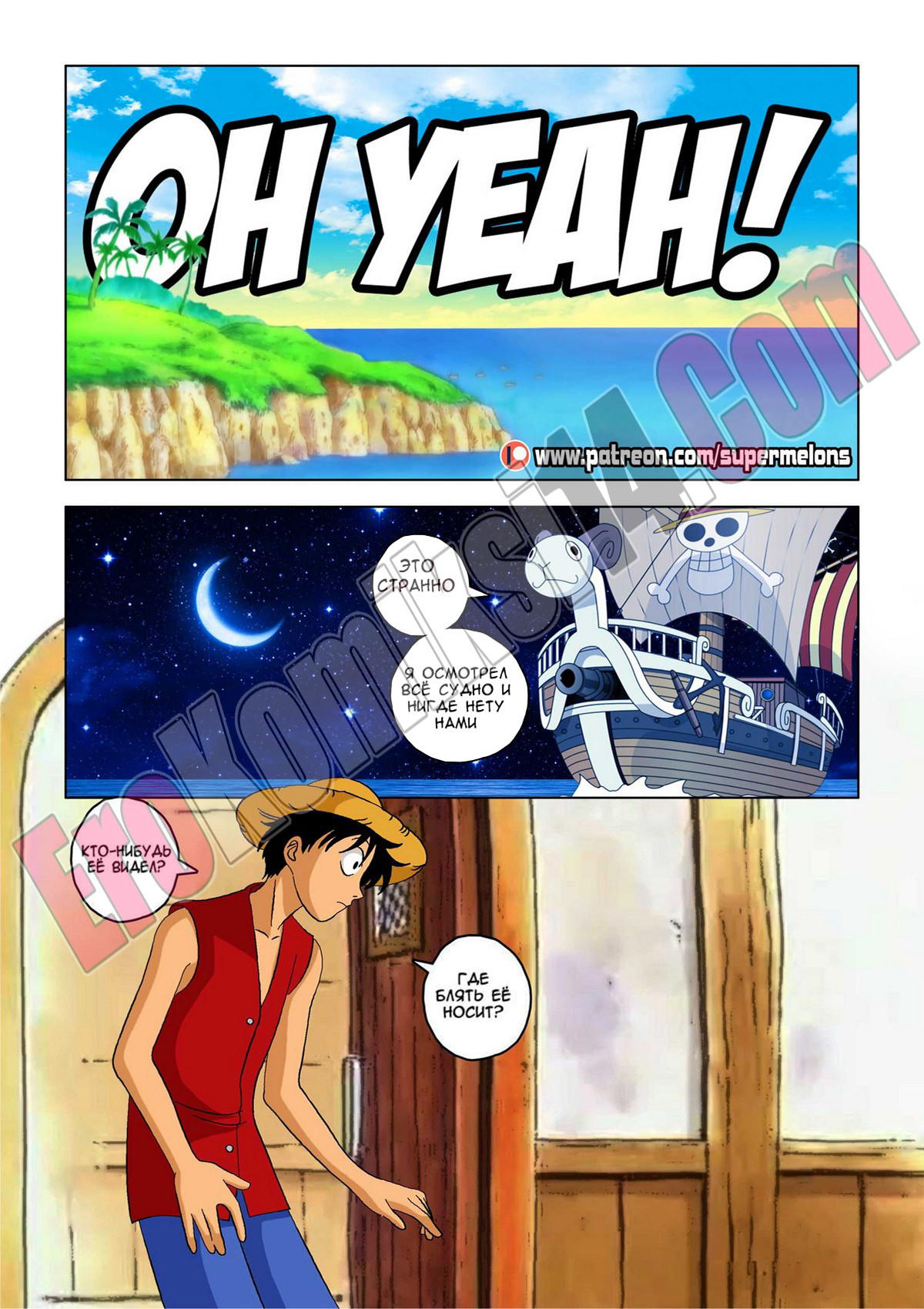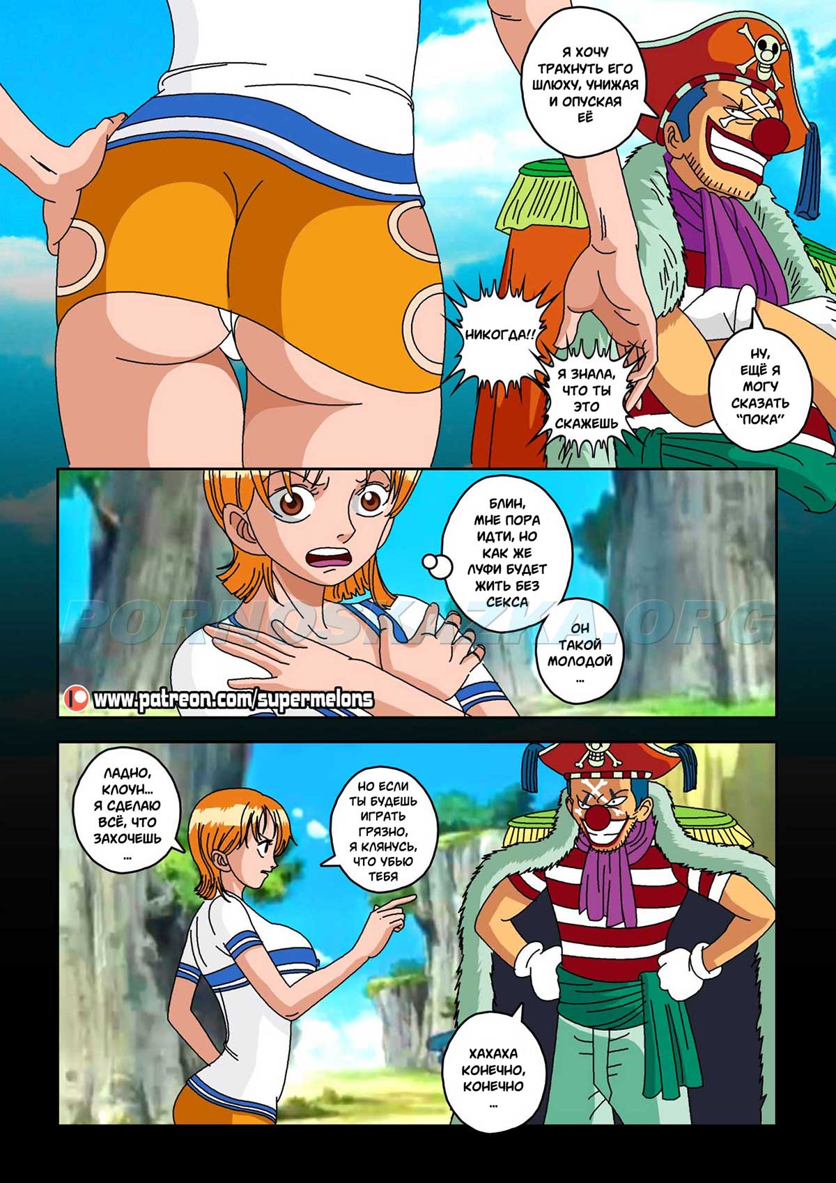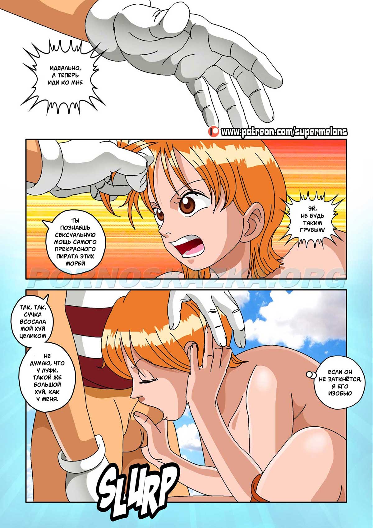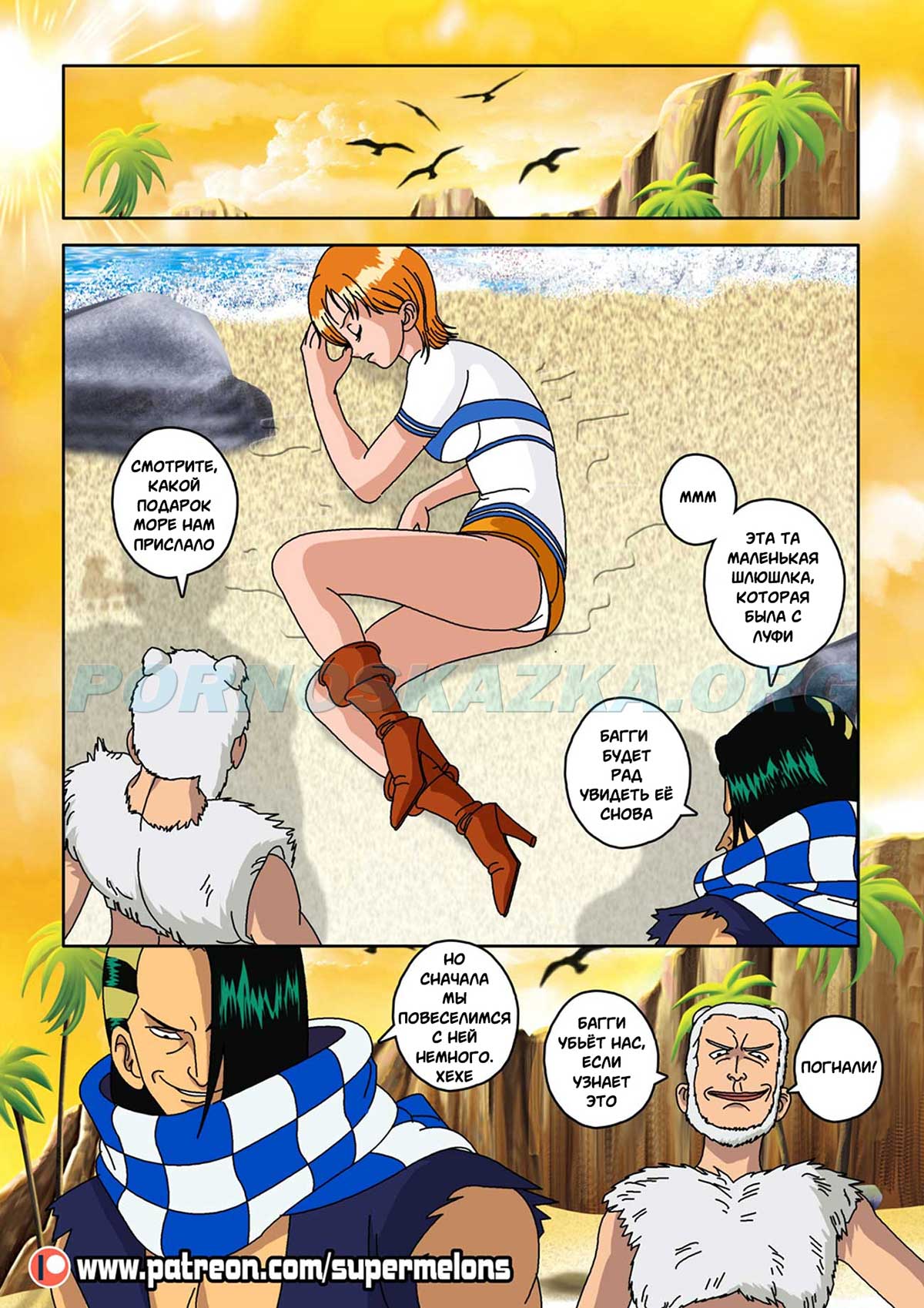 Секс комикс Ван Пис. Семя дьявола. Один юноша слопал фрукт дьявола и после этого его тело, типа, начало сдуваться, парень разучился плавать и самое важное: у него пропал стояк! И такое западло, по поводу эрекции выяснилось как раз в тот момент, когда сексапильная девушка предложила ему трахаться! Парня, конечно жаль, а девушка… да, эта сучка нашла ему уже замену…