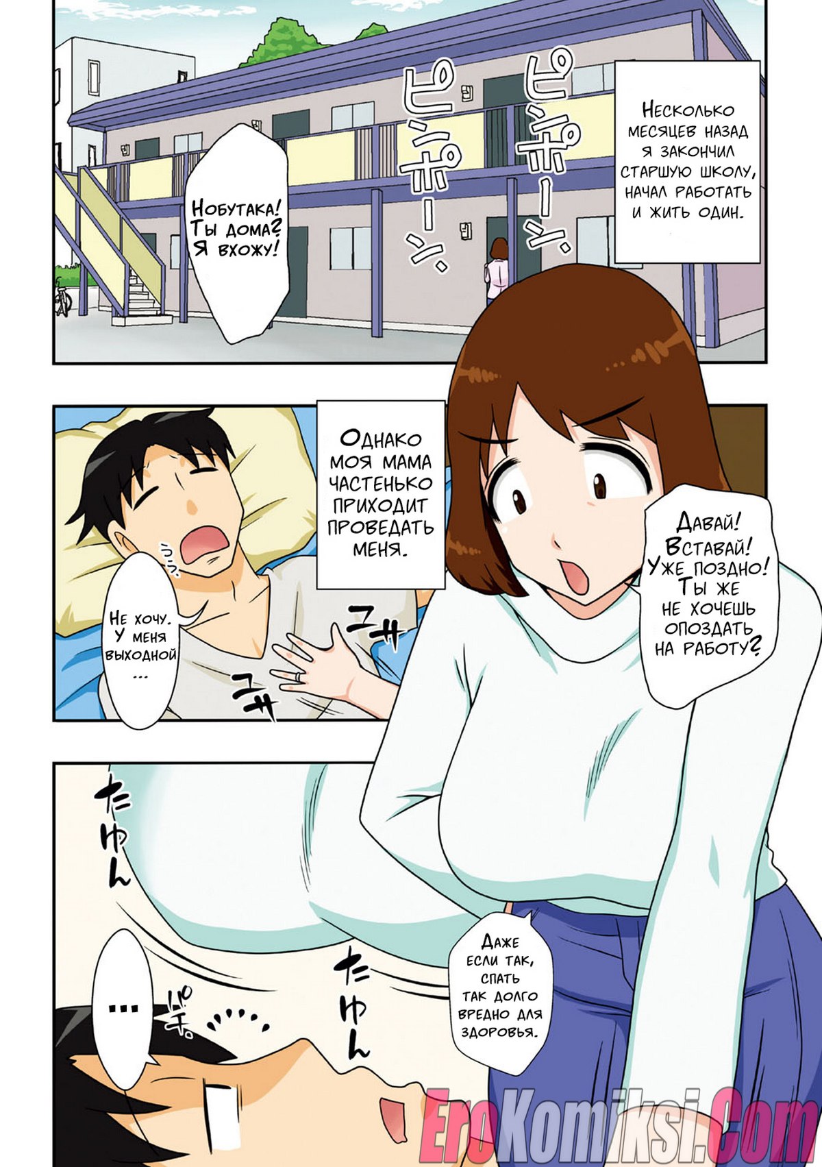 Секс комикс Вот так я переспал с мамой! Нобутака окончил школу и уже как несколько месяцев живёт отдельно от родителей. Правда его мама всё ещё навещает своего никудышного сына. Готовит ему еду и прибирается в его квартире. А во время таких визитов сын всячески домогается до матери, правда она всё это воспринимает лишь как раздражающие шалости. Поняв, что он никак не продвинулся в отношениях с матерью, Нобутака идёт на крайние меры! Встаёт перед матерью голым и умоляет ему подрочить.